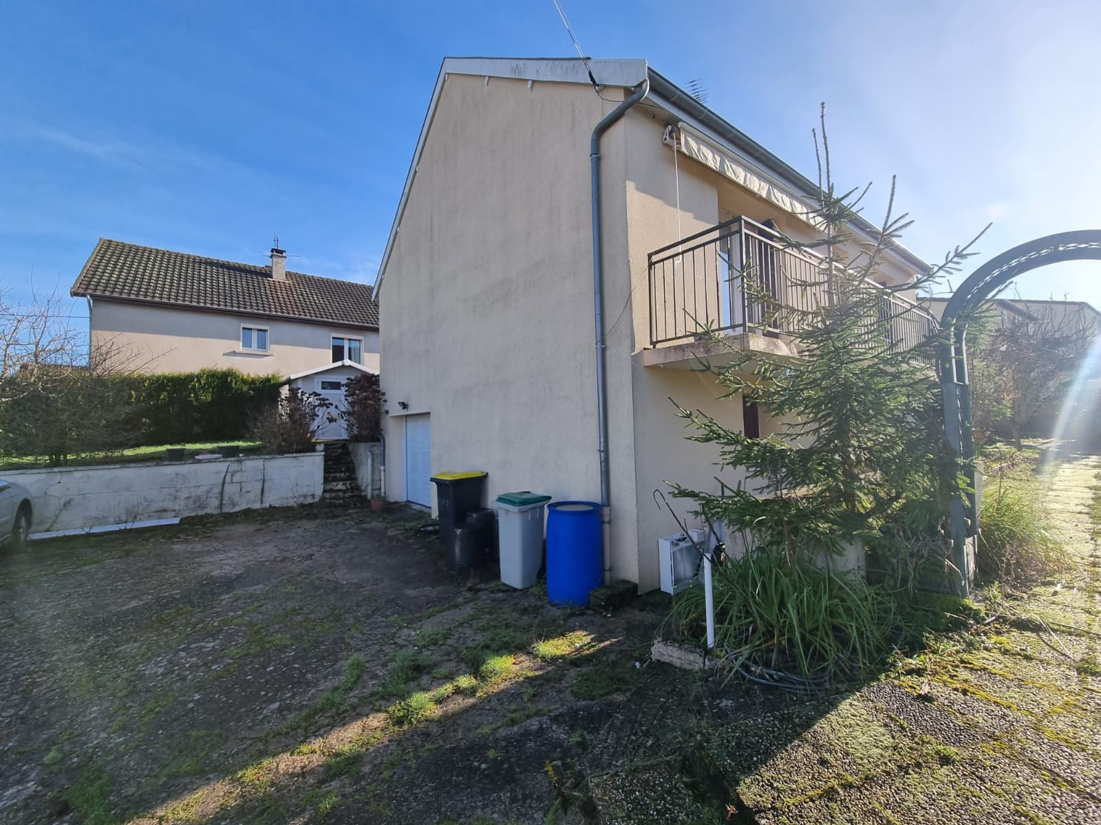 Maison année 70 sur sous-sol complet et terrain de 638 m². L'accès à l'étage d'habitation se fait depuis l'extérieur par un escalier en façade avec balcon terrasse sud-ouest. Le hall d'entrée distribue d'un côté une cuisine indépendante meublée et de l'autre un salon séjour ouvrant sur la terrasse, largement éclairée par une porte-fenêtre; Puis la partie nuit composée de deux chambres une salle d'eau et un wc.