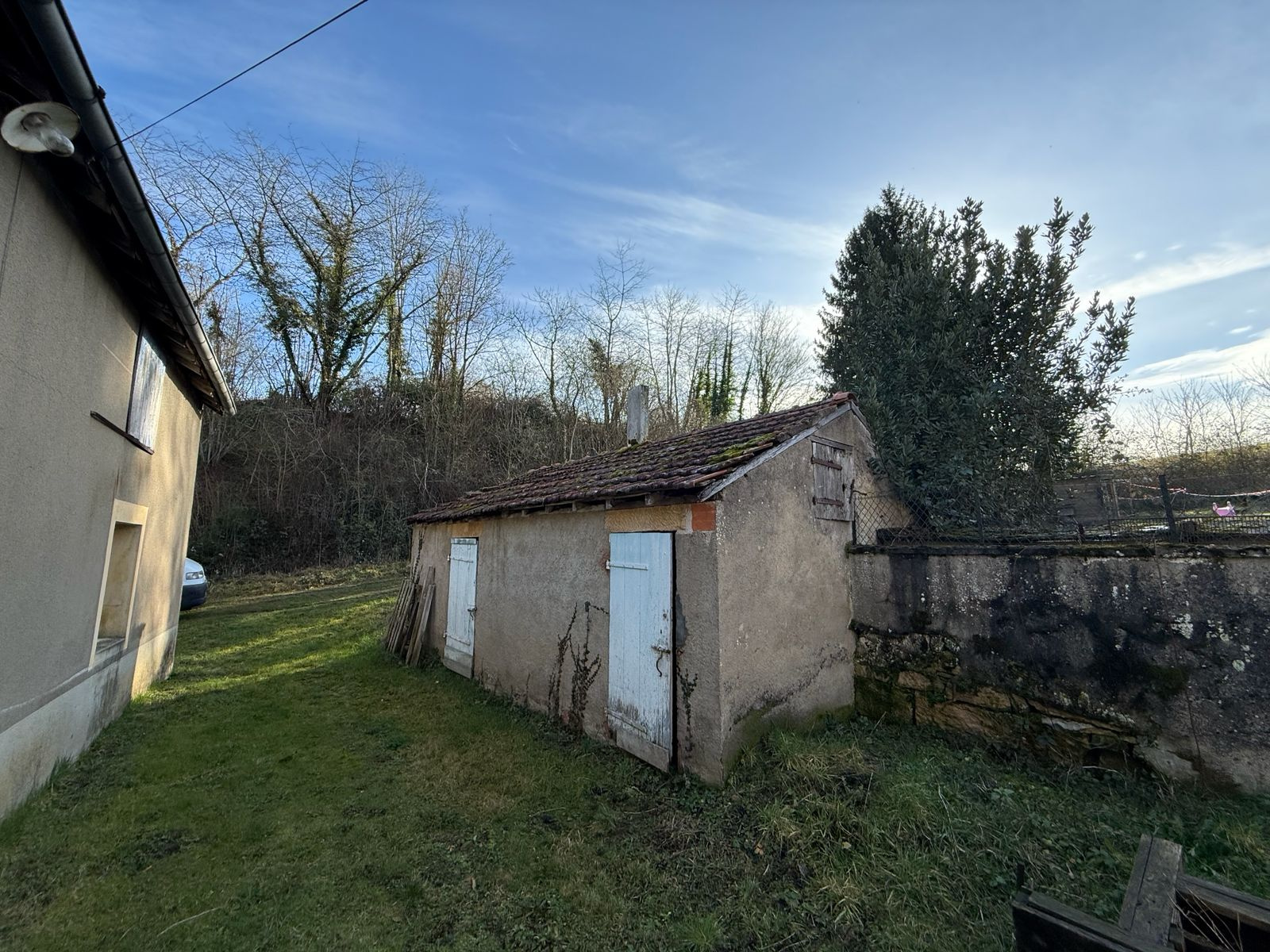 Une longére attenante à la maison principale offrant de nombreuses possibilités d’aménagement. Elle comprend plusieurs garages et dépendances, idéals pour du stockage, atelier ou projet personnel. Une partie peut également être aménagée en petit appartement.